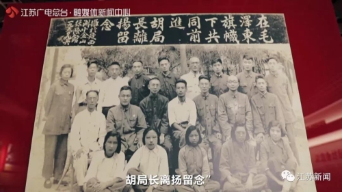 在照片中,21個人分三排排列,照片上方印著“在毛澤東旗幟下共同前進,胡局長離揚留念”。