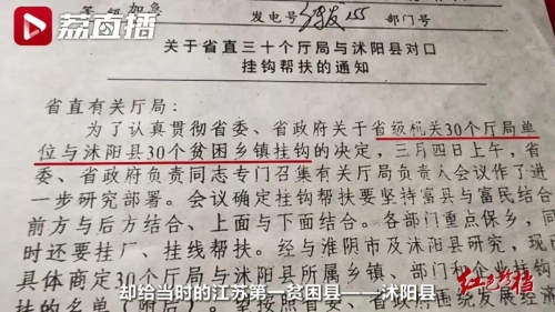 在江蘇省檔案館里收藏著這樣一份電報,發出的時間是1992年,內容是通知省直30個廳局對口掛鉤幫扶沭陽。