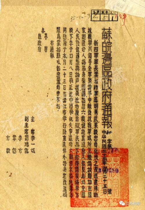 大家好,我是江蘇省檔案館的紅色珍檔守護人孫潔。今天我要講解的紅色珍檔,是《蘇皖邊區政府關于決定改鹽城縣為葉挺縣的通報》。