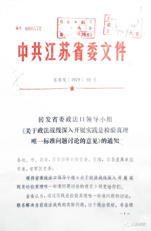 大家好,我是江蘇省檔案館的紅色珍檔守護人封鋒。今天我要介紹的紅色珍案,是中共江蘇省委《轉(zhuǎn)發(fā)省委政法口領(lǐng)導小組〈關(guān)于政法戰(zhàn)線深入開展實踐是檢驗真理的唯一標準問題討論的意見〉的通知》。