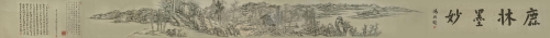 內容及評介:戴熙,號鹿床,謚文節,清咸豐年間官至兵部侍郎。詩書有名于時,山水畫尤為人所重。館藏戴熙水墨山水畫卷長4米,畫法類似金陵畫派,濃淡得當,層次分明。畫前有安徽巡撫馮煦題詞“鹿床墨妙”。畫后有戴熙后人所寫此畫創作緣由,以及清末安徽代理巡撫沈曾植的評價。該山水畫卷以畫為主,字畫一體,相得益彰,是難得的藝術珍品。