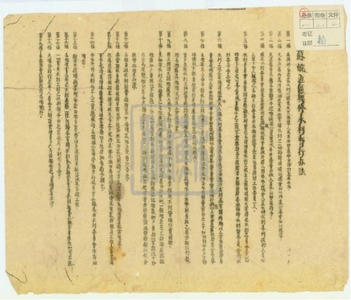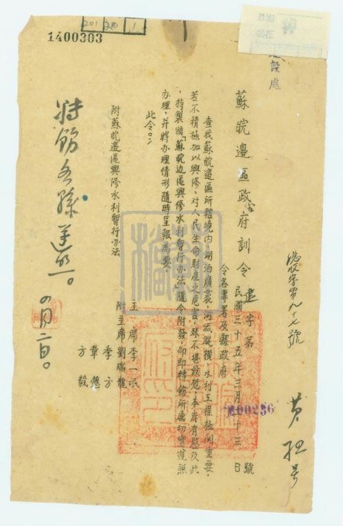 1946年3月,蘇皖邊區(qū)政府關(guān)于頒布興修水利暫行辦法的訓(xùn)令。