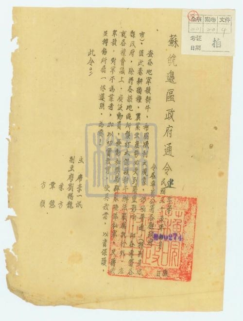 1946年4月,蘇皖邊區(qū)政府關(guān)于保護(hù)耕牛的通令。