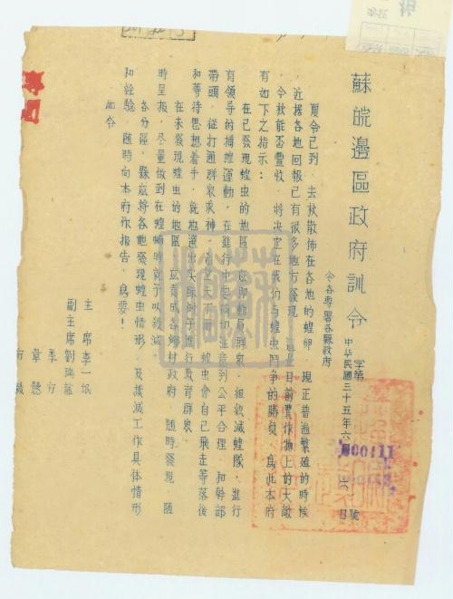 1946年6月,蘇皖邊區(qū)政府關(guān)于防治蝗蟲(chóng)的訓(xùn)令。
