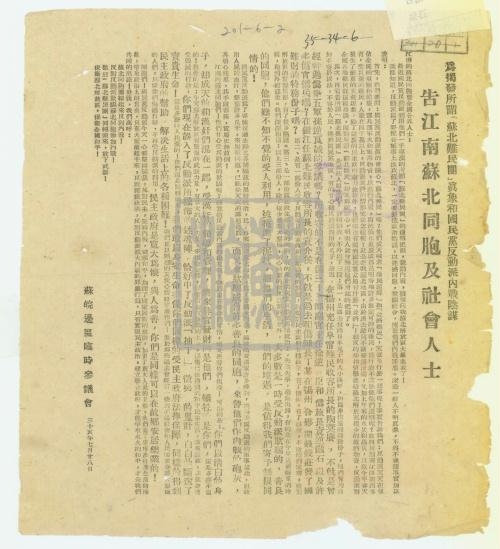 1946年7月蘇皖邊區(qū)臨時(shí)參議會(huì)《為揭發(fā)所謂“蘇北難民團(tuán)”真象和國(guó)民黨反動(dòng)派內(nèi)戰(zhàn)陰謀告江南蘇北同胞及社會(huì)人士》