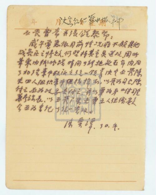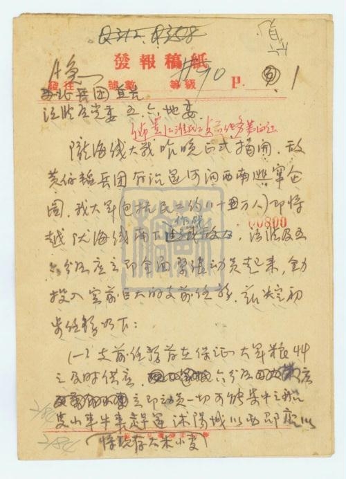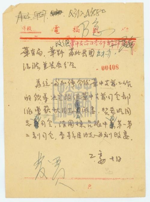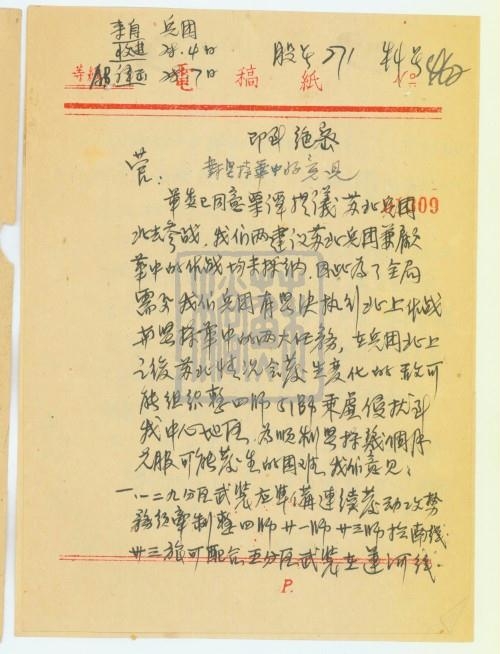 內(nèi)容與評(píng)價(jià):在20世紀(jì)的大部分時(shí)間里,電報(bào)都是一種十分快捷的信息傳遞方式,特別是在戰(zhàn)爭環(huán)境下,電報(bào)的作用尤其明顯。電稿是電報(bào)稿的簡稱,結(jié)構(gòu)很像書信、便條,稱呼、提稱語、末啟辭、時(shí)間、印信等,有些常被被省略。與正式文件相比,電稿格式更簡單,內(nèi)容更簡潔,但是信息量卻很大,因而是正式文件的重要佐證和補(bǔ)充。