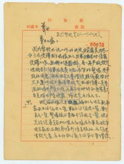 館藏1947到1949年華中工委、華東局、蘇北軍區(qū)和蘇南區(qū)黨委等領(lǐng)導(dǎo)機(jī)關(guān)單位各種往來電稿檔案共有895件。其中大部分是有固定印刷格式的電稿,名稱分別有:抄報(bào)紙、收?qǐng)?bào)紙、發(fā)報(bào)紙、電稿紙、發(fā)報(bào)稿紙、發(fā)電稿紙等。多注明等級(jí)、序號(hào)、來文單位、收到及譯出時(shí)間;也有相當(dāng)一部分是沒有任何格式的,甚至全部采用手寫,收發(fā)文時(shí)間、作者、等級(jí)等不詳或很簡略。電稿等級(jí)有A、A急、B、B急等,也有一些未標(biāo)等級(jí)。內(nèi)容涵蓋軍事、宣傳、教育、文化、財(cái)經(jīng)、公安、支前等方面,是研究解放戰(zhàn)爭中、后期華中工委、華東局等重要領(lǐng)導(dǎo)機(jī)關(guān)單位許多重大戰(zhàn)略決策部署的產(chǎn)生、發(fā)展和變化過程的第一手資料, 具有很高的史料價(jià)值。