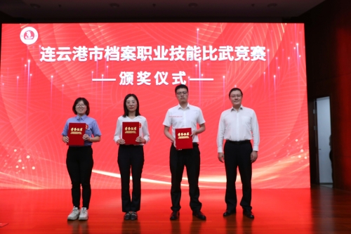 連云港市檔案館黨組成員、副館長葛新成、王道興,中國電信連云港分公司副總經理耿昱為優秀獎獲得者頒獎