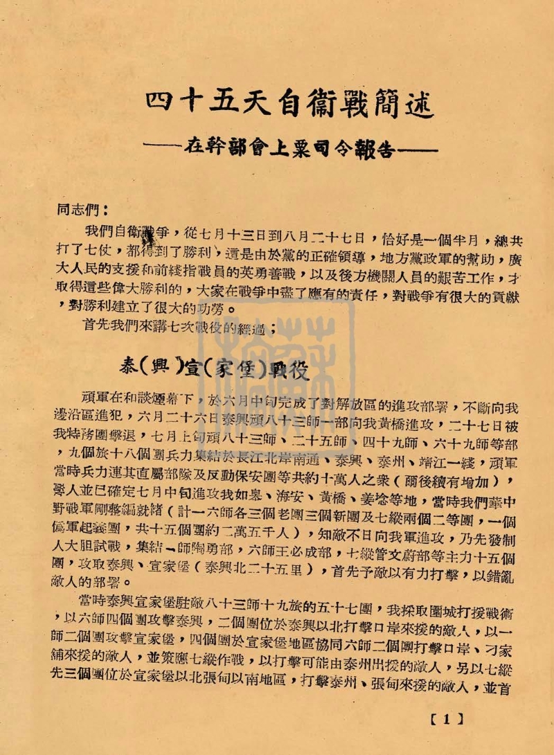 蘇中七戰(zhàn)七捷的概述:(9月25日)粟裕在干部會(huì)上的報(bào)告摘選