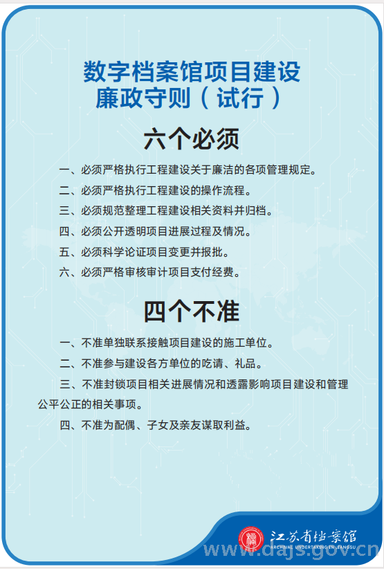 檔案信息化處黨支部結合目前正在建設的省數字檔案館項目,制定《數字檔案館項目建設廉政守則(試行)》,提出項目建設過程中要嚴格遵循“六個必須”“四個不準”原則,常態化提醒支部黨員在項目建設中嚴守工作紀律,強化紀律保障,護航項目建設。支部結合業務工作,開展廣泛交流研討,全面梳理工作中可能會存在的廉政風險點和監督管理中的薄弱環節,切實增強黨員干部廉政風險防控意識,提升廉政風險防控能力。