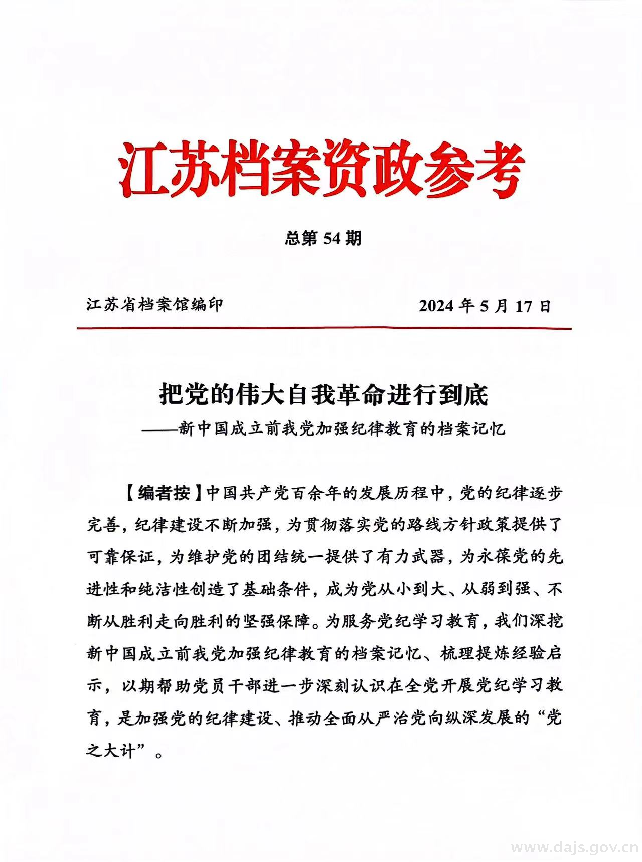 檔案資源開發處黨支部精心為黨紀學習教育提供高質量檔案服務。深挖新中國成立前我黨加強紀律教育的檔案資料,梳理提煉經驗啟示,精心編寫《把黨的偉大自我革命進行到底——新中國成立前我黨加強紀律教育的檔案記憶》資政參考文章,獲得廣泛好評。
