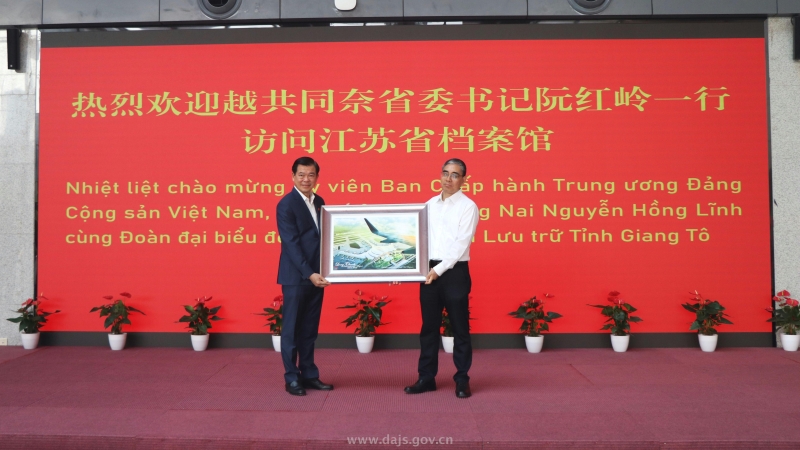 參觀結束后,阮紅嶺與顧俊分別代表同奈省代表團與江蘇省檔案館,互贈了紀念禮品,以示友好。
