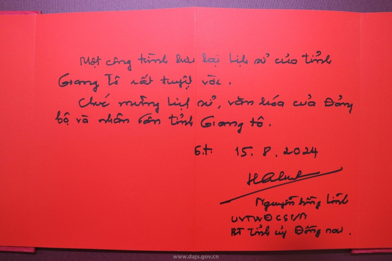 參觀特藏庫結束后,阮紅嶺對省檔案館工作表示高度贊賞,特地留言寫道“江蘇省在歷史文獻資料保護方面做得非常出色,謹向這里黨和人民的歷史文化表示祝賀。”