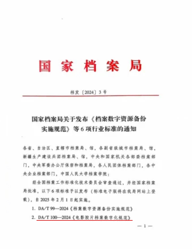 近日,國家檔案局正式發布6項檔案行業標準,《電影膠片檔案數字化規范》(標準號DA/T100—2024)名列其中。《電影膠片檔案數字化規范》由國家檔案局檔案科學技術研究所牽頭,江蘇省檔案館作為主要起草單位參與研制工作。