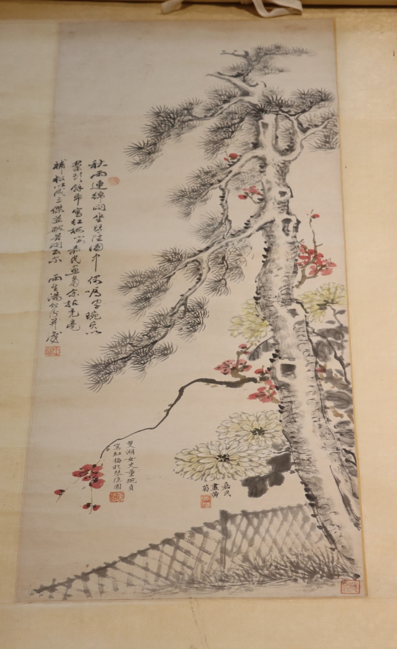作品中形成年代最早的是清代湯貽汾與妻子董琬貞及女兒湯嘉民合作的國(guó)畫(huà)《三友圖》。湯貽汾,武進(jìn)人,清代詩(shī)人、畫(huà)家、學(xué)者。其妻董琬貞是清代著名書(shū)畫(huà)家。女兒湯嘉民自幼喜愛(ài)畫(huà)白描人物、花卉。《三友圖》是湯貽汾晚年寓居南京時(shí)與妻女合作作品,“內(nèi)子琬貞以案頭余紙寫(xiě)紅梅,小女嘉民畫(huà)菊,余拈禿毫補(bǔ)松以成三杰”。作品描繪了松之蒼勁、梅之清雅與菊之高潔,三者同框共生,構(gòu)成一幅獨(dú)特的溫情畫(huà)卷,仿佛一個(gè)和睦家庭的三種美好品質(zhì)相互依偎。這幅畫(huà)作不僅具有非凡的藝術(shù)價(jià)值,其“一家執(zhí)筆”的創(chuàng)作過(guò)程本身,正是“家和萬(wàn)事興”最生動(dòng)的寫(xiě)照,恰與中秋佳節(jié)祈愿團(tuán)圓、美滿(mǎn)的深厚內(nèi)涵相契合。