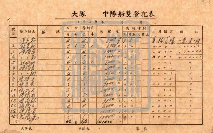 內容與評價:1949年2月13日,中共華中工委成立渡江準備委員會,統一一切渡江工作的領導,包括情況偵查、糧食南運、船只準備、民工調度等等。下設渡江船只管理局,對籌集來的船只進行檢查、分類、維修、訓練、調度。華東野戰軍司令員陳毅曾深情地說:“淮海戰役的勝利,是人民群眾用小車推出來的。”其實何止小車?人民群眾貢獻了后勤所需要的,包括牛馬車船在內的一切。登記表中記錄了船戶姓名,家庭勞動力情況以及船只情況。70 多年間物是人非,但當年那一個個勤勞勇敢的名字卻長留在檔案中,成為我們寶貴的精神財富。