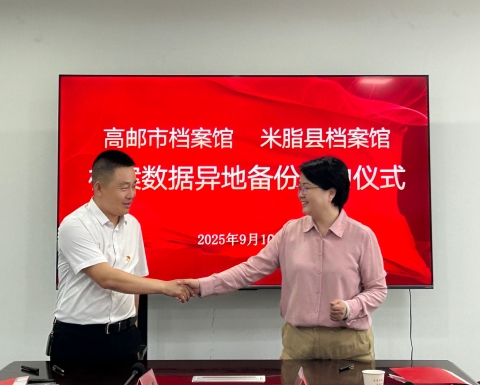 為深入貫徹落實國家檔案局關于檔案數據異地備份工作相關要求,保障館藏檔案數據的完整安全,9月10日,高郵市檔案館赴陜西省榆林市米脂縣檔案館開展館藏檔案數據異地備份工作。此次異地備份數據覆蓋高郵市檔案館2025年前形成的所有數字化成果,共計13塊硬盤,數據量35.27TB。